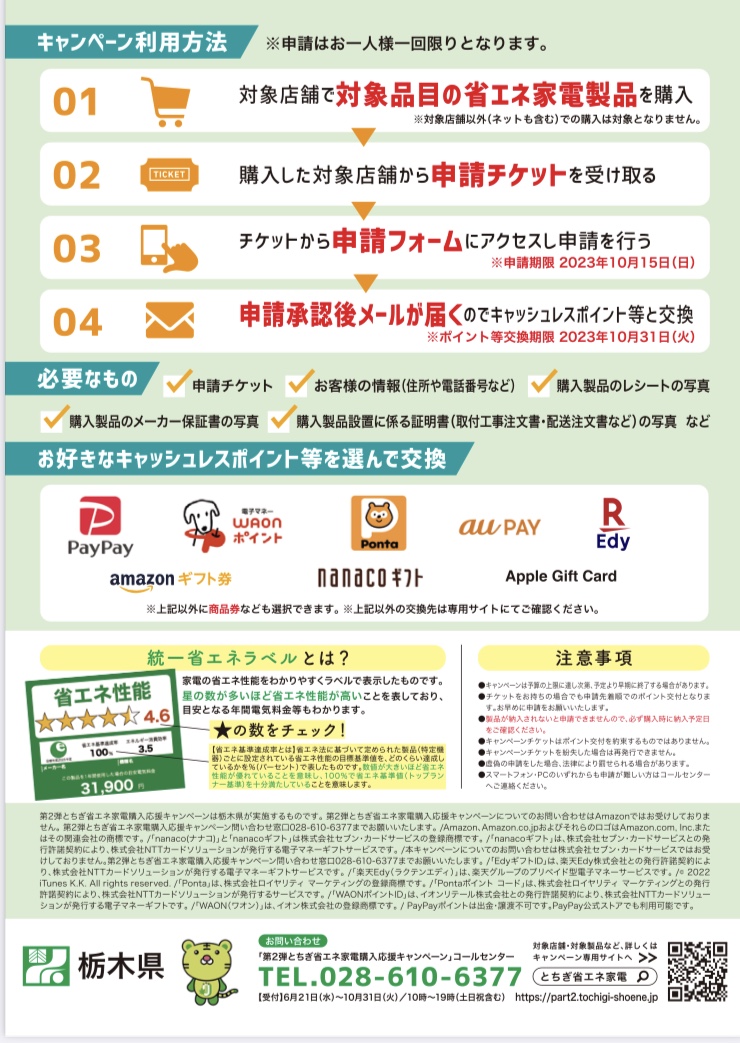 7月14日(金)より、 とちぎ省エネ家電購入応援キャンペーン の第2弾がはじまります。 前回同様にエアコン・冷蔵庫・LED照明に加え、 給湯器の省エネ基準達成商品をご購入のお客様に 栃木県よりキャッシュレスポイント 最大3万円還元されます。