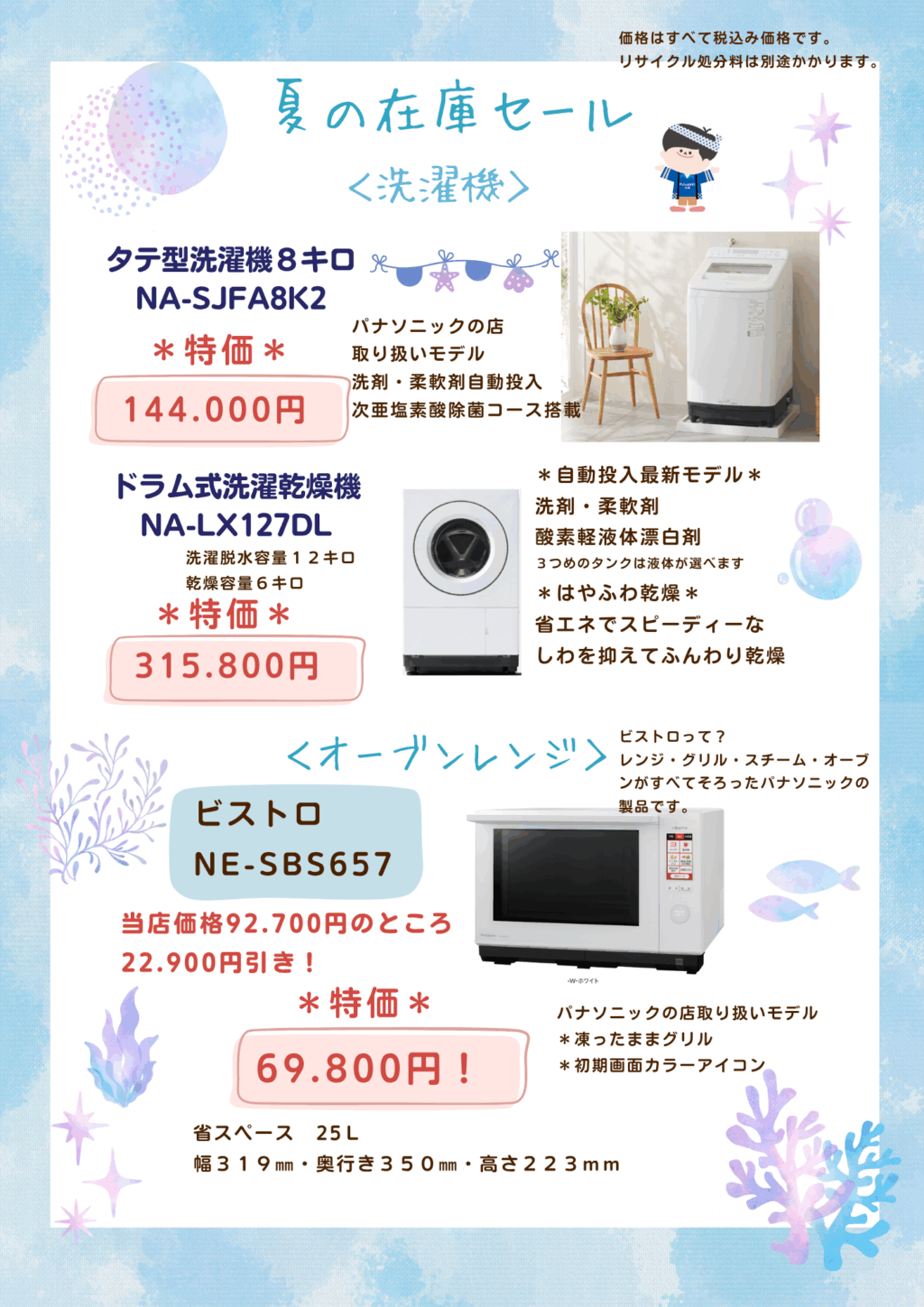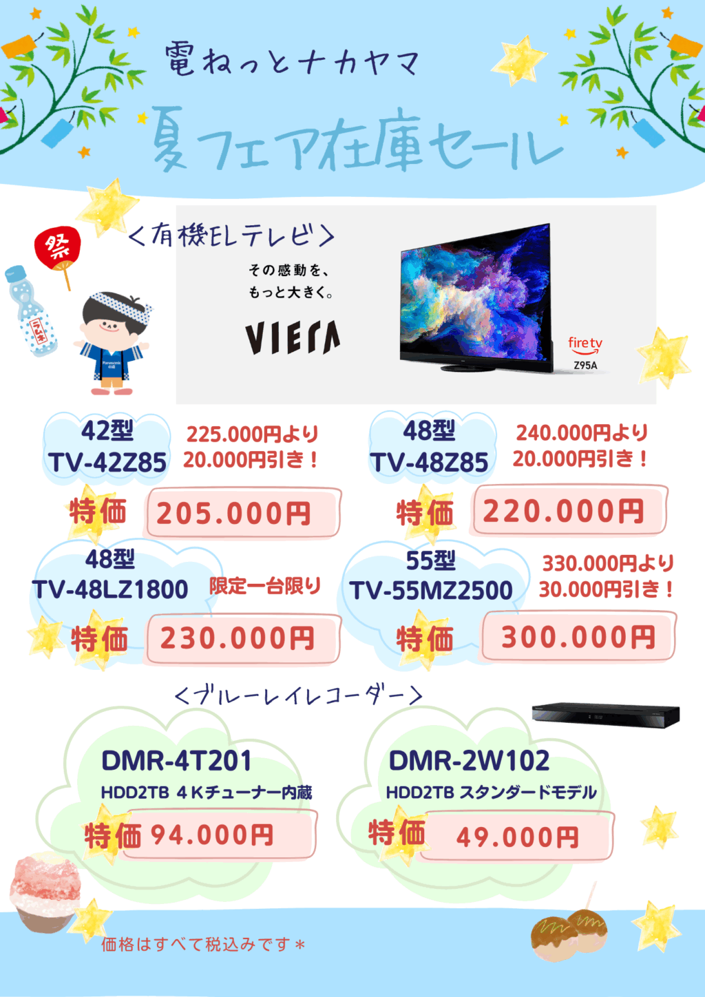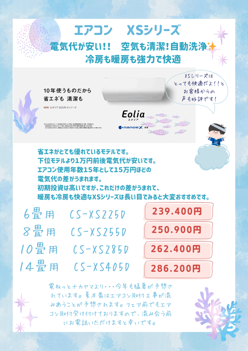 6月からすでに暑い日がつづいております。皆様いかがお過ごしでしょうか。 電ねっとナカヤマもエアコン関係の依頼が増えてきました。 夏のパナソニックフェアいよいよ来週となってきました。 今年も多数のお買い得商品をご用意してお待ちしております。