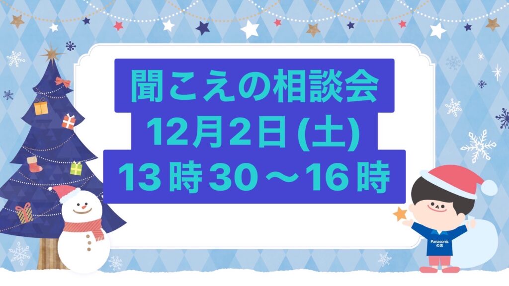 12月の聞こえの相談会のお知らせ 12月2日(土) 13時30分から16時まで 当店にて 冬のパナソニックフェア2日目に行います。 いよいよ年の瀬ですが、 聞こえの不安のある方がいらっしゃいましたら、 お気軽にお越しください。 パナソニック補聴器専門相談員が来店し、 丁寧に聴力検査、ご相談承ります。 フェアご来店のついでに ぜひ聞こえを調べてみてはいかがでしょうか。