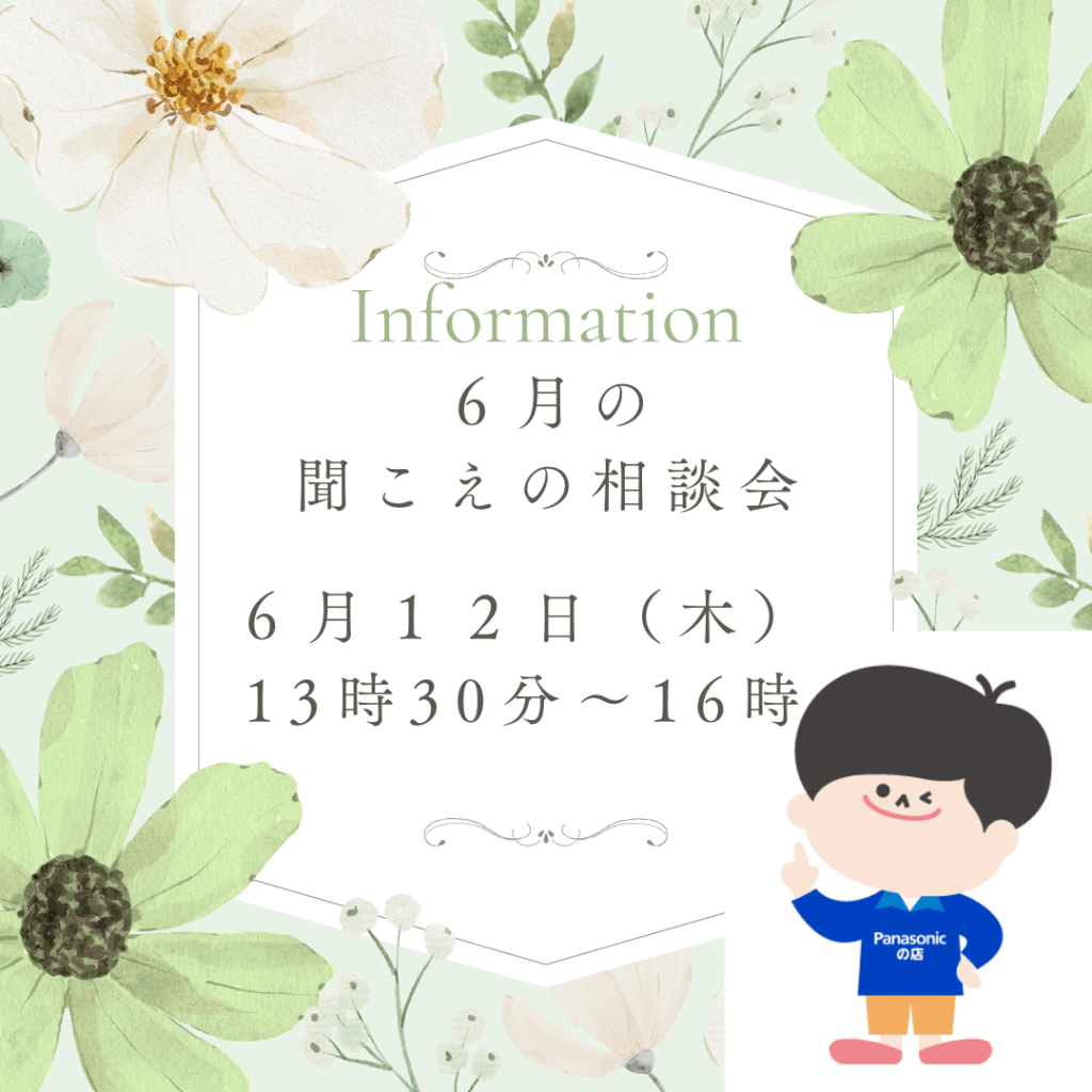 聞こえの相談会のお知らせです。 パナソニック補聴器の専門相談員が来店します。 詳しい聴力検査や聞こえのご相談をお伺いいたします。 ぜひお越しください。知らないうちに進んでいる聴力の衰え。 心配だな、、という方はぜひ無料で検査できますので お気軽にお問い合わせください。