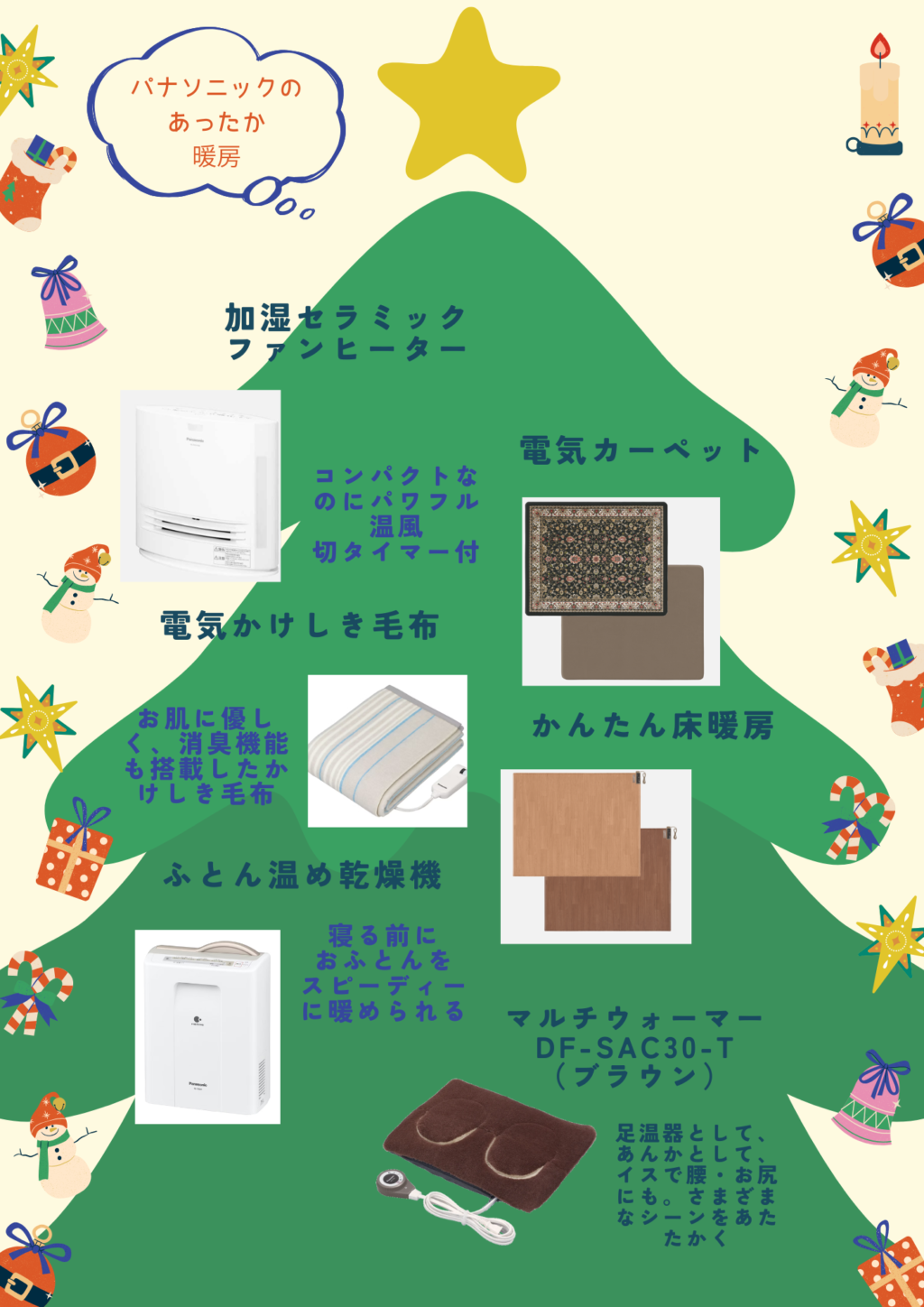 寒い季節になってきました。 皆様いかがお過ごしでしょうか。 冬のパナソニックフェアでは暖房器具も さまざまご用意しております。 今のうちにあったかグッズを用意しておきましょう!
